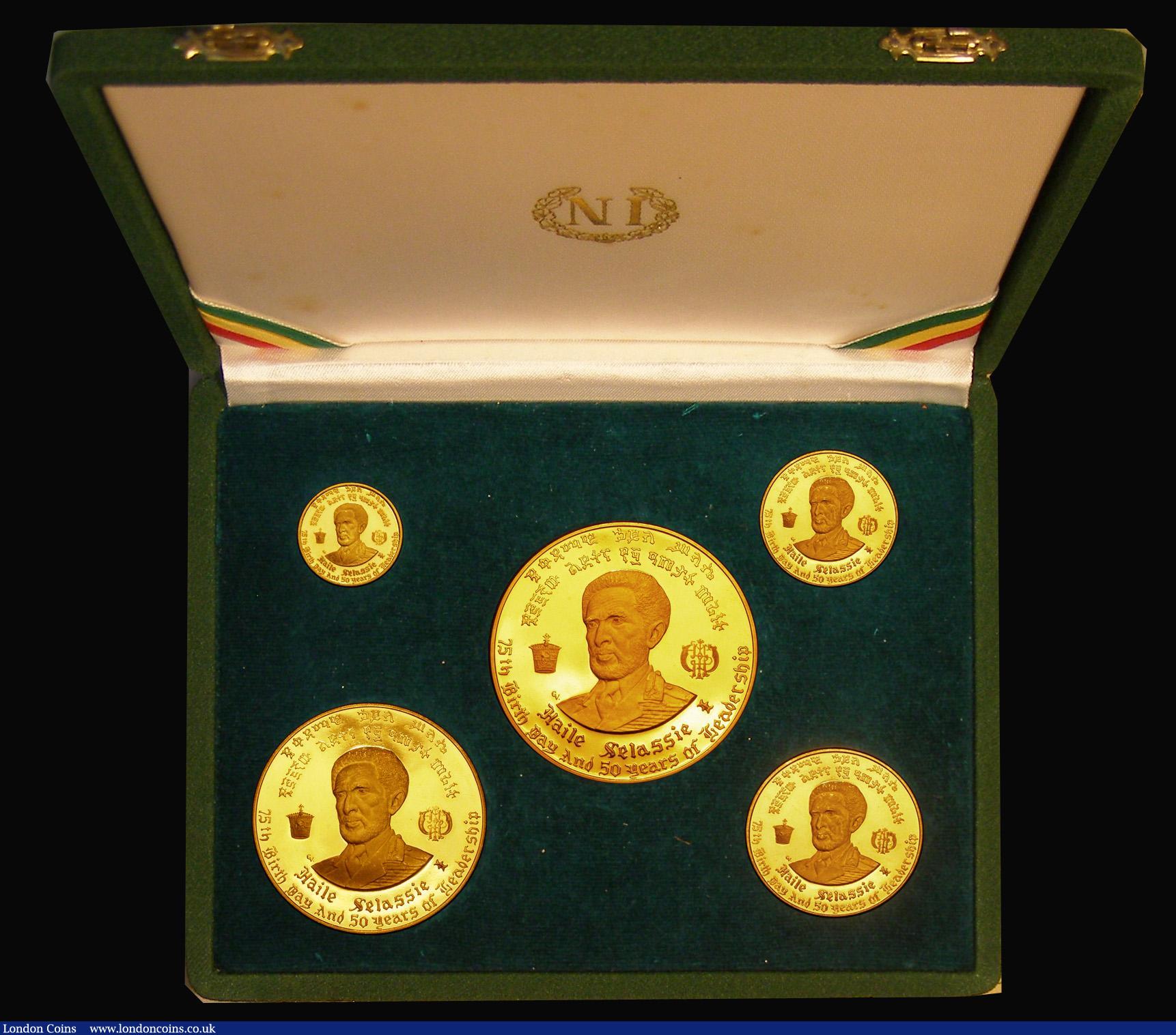 EthiopiaProof Set 1966 (EE1958) a 5-coin set in gold 75th Birthday and 50th Year of Leadership of Emperor Haile Selassie comprising 200 Dollars KM#42, 100 Dollars KM#41, 50 Dollars KM#40, 20 Dollars KM#39 and 10 Dollars KM#38 total AGW 4.4oz. nFDC retaining considerable mint brilliance, a stunning set, in the original green box of issue with certificate