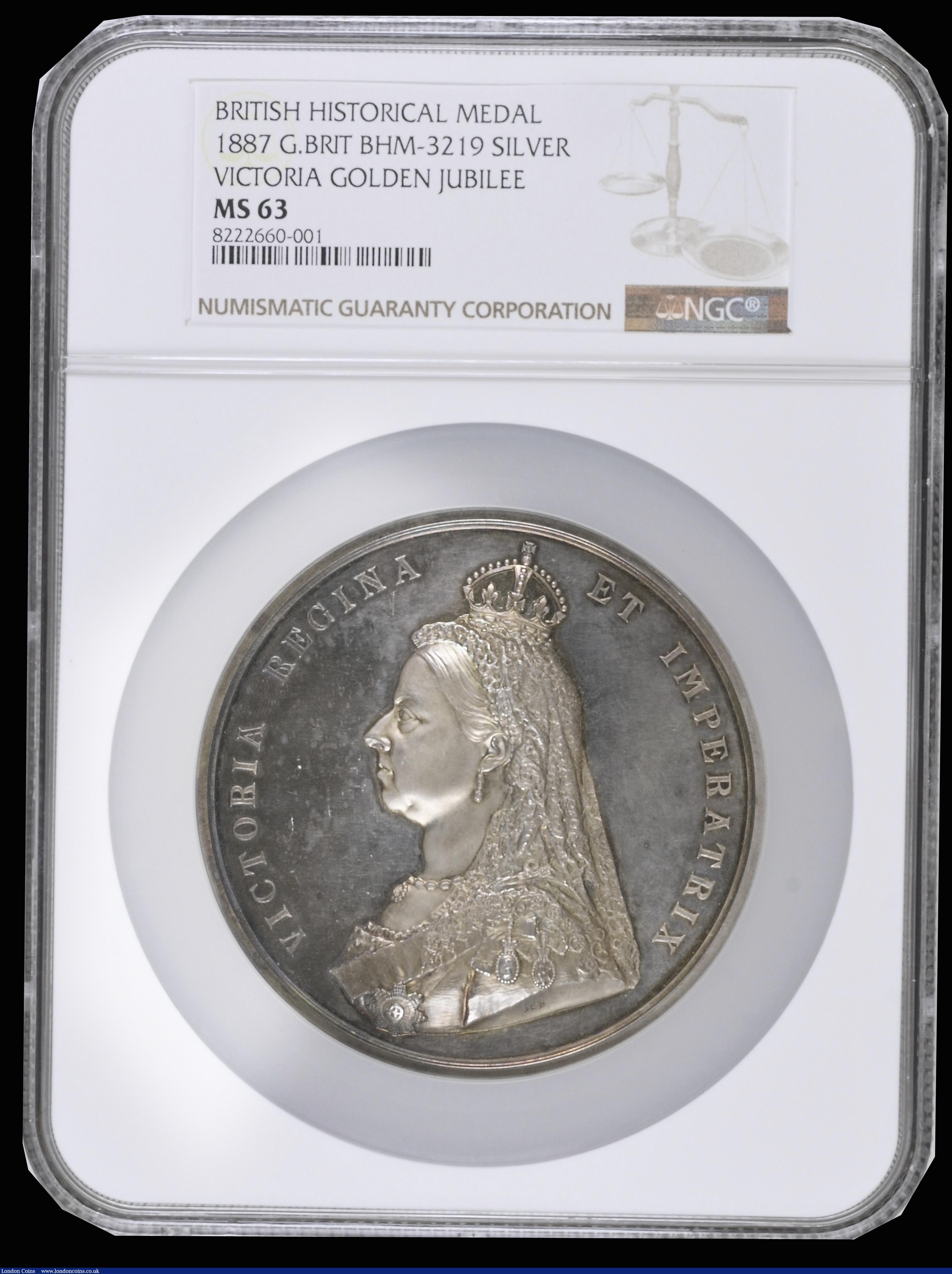 Queen VictoriaGolden Jubilee 1887 the Official Royal Mint issue, 77mm diameter in silver by J. Boehm/ F.Leighton, Eimer 1733, BHM 3219, WE 2000, Obverse: left facing bust VICTORIA REGINA ET IMPERATRIX , Reverse: Enthroned figure of Empire facing, flanked by standing figures of Science, Letters, and Art, left opposite these of Industry and Agriculture, at their feet below Empire, are Mercury reclining, and Time. Above: Two cherubs displaying shields inscribed MDCCCLXXXVII and MDCCCXXXVII and VRI in a wreath, between IN COMMEMORATION. In Exergue: Five interlinked shields inscribed ASIA, AMERICA, EUROPE, AUSTRALASIA, and AFRICA, a high grade example, 217.00 grammes, Choice UNC with a pleasing tone and graded MS63 by NGC rare in this high grade
